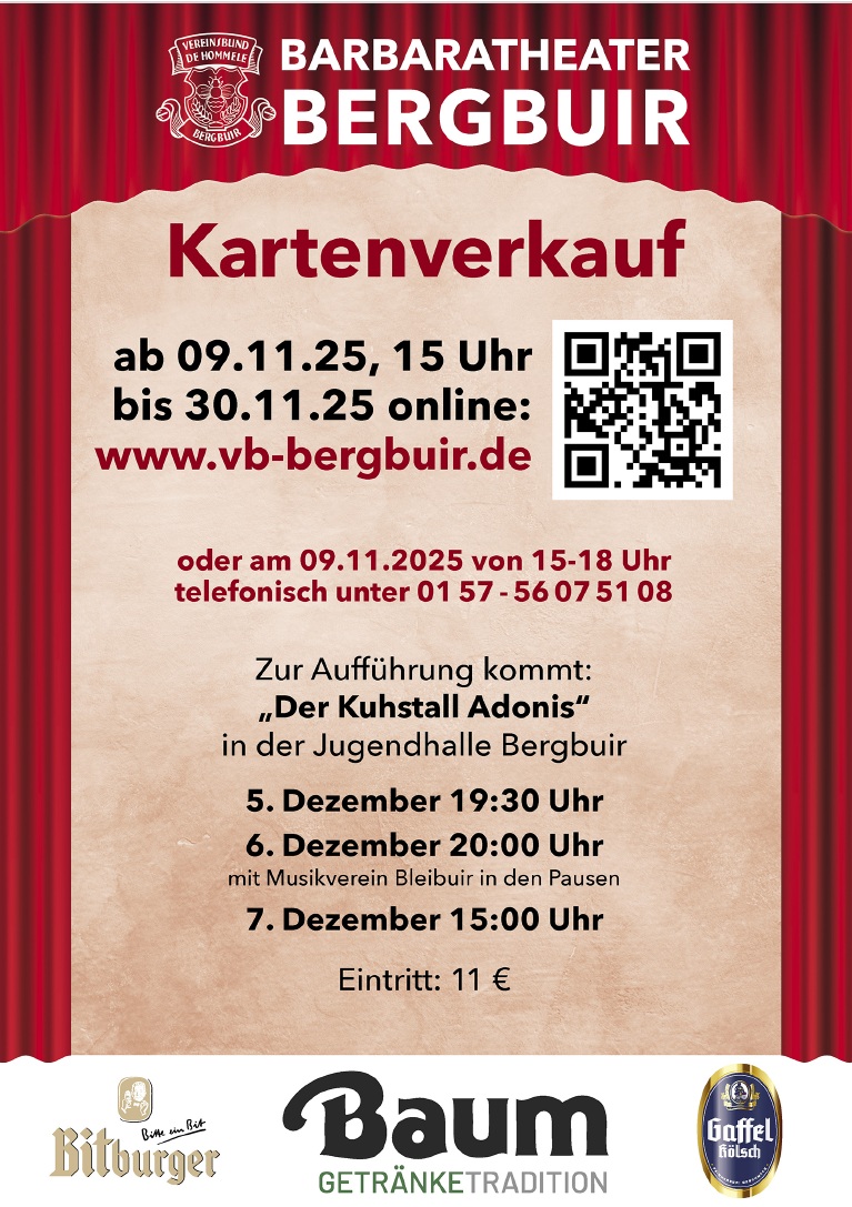 Der Vereinsbund „De Hommele“ Bergbuir e.V. besteht aus den Abteilungen Theater, Tischtennis, Dorfverschönerung, Karneval, Heimat & Brauchtum, Junggesellen und Tambourcorps.Die Jugendhalle Bergbuir befindet sich im Eigntum des Vereins und dient den Abteilungen als Versammlung-, Trainings- und Probenort sowie zur Ausrichtung von Veranstaltungen. Sie kann zur Durchführung privater Feierlichkeiten gemietet werden. |